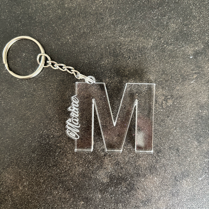Porte-clés lettre en acrylique transparent,  au design épuré et moderne, monté sur anneau métallique.