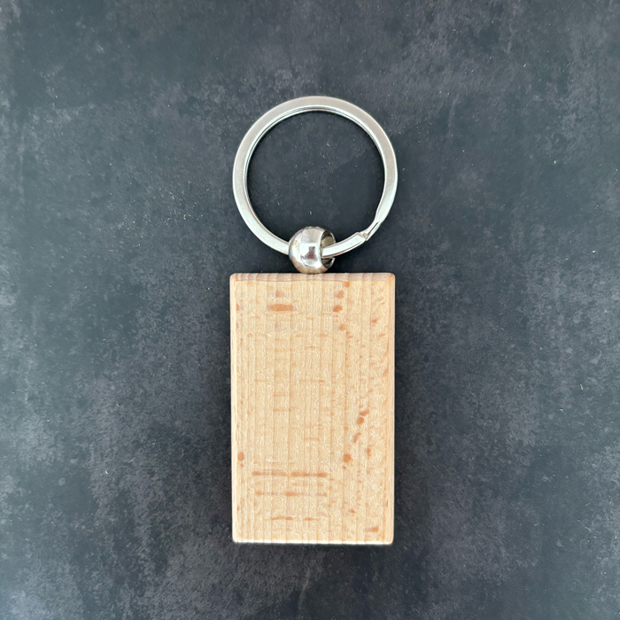 Porte-clés rectangulaire en bois naturel, au style sobre et authentique, avec anneau métallique solide.